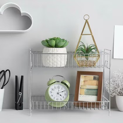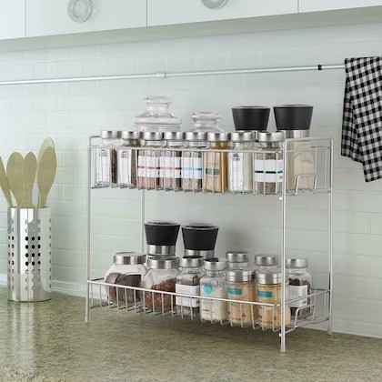 The wide and tall countertop spice rack accommodates larger spice bottles and cans offering a space-saving and easy to access solution for chefs and cooks. The free-standing rack can be moved and positioned in almost any location including kitchen countertops, cabinets, pantry, or even other rooms in the house. It can be easily utilized for bathroom, make-up and nail polish storage or used for storing crafts goods and ribbons. The versatile and multi-purpose rack is a great solution for kitchen or home storage and organization.